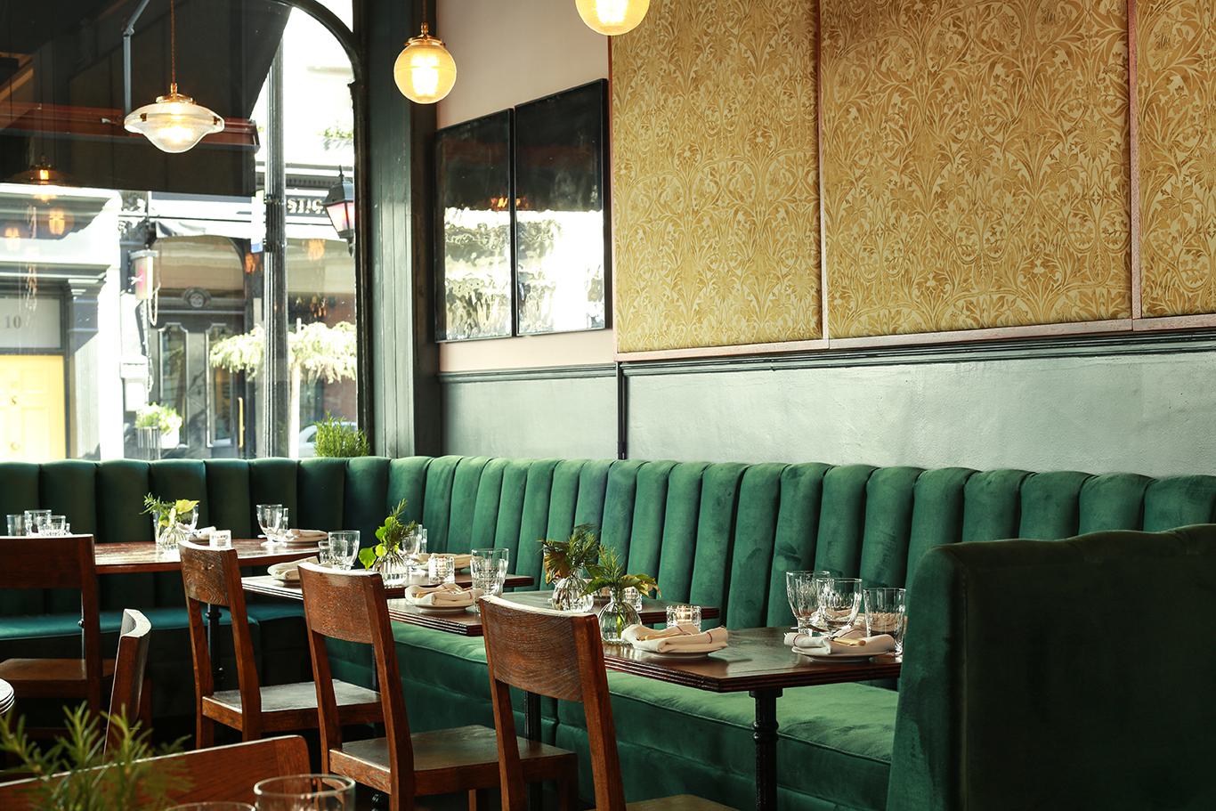 Cora Pearl is situated in a Covent Garden townhouse; it showcases our bespoke fluted banquette seating in the most gorgeous forest green. The green is wonderfully offset by dark wood pieces and plush stylings.